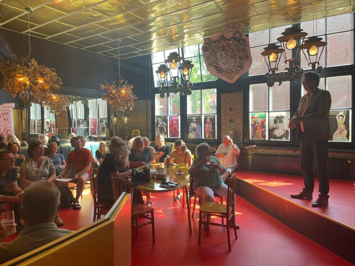 Ze hebben er maanden aan gewerkt, maar het resultaat mag er zijn. De nieuwe kantine van het NKT is al een tijdje in gebruik, maar werd op zondag 12 juni feestelijk geopend door de Vrienden van het NKT. Dankzij hun financiële bijdrage en de fysieke kluscapaciteiten van Ronald Dassen en René Burgers kunnen leerlingen en bezoekers van het NKT genieten van een sfeervolle, theatrale, nieuwe kantine. De bankjes zijn opnieuw bekleed, alles is geschilderd en opnieuw behangen, er hangen kroonluchters (waarvan persoonlijk elk blaadje goud gespoten is), de tafels zijn handmatig omgetoverd tot goud/blauw gemarmerde exemplaren en er is een klein podiumpje. Artistiek leider Jeroen Man: ‘Ik werd geïnspireerd door de sfeer bij Tuschinski. Dankzij de Vrienden van het NKT hebben we nu een burlesque aandoende kantine, waarin we ook kleine voorstellingen, presentaties en andere evenementjes kunnen organiseren. We zijn er heel blij mee!’ De aanwezigen genoten van een stukje taart, koffie & thee, waarna Jeroen de eer had (samen met zijn ouders) het lint officieel door te knippen. De aanwezigen kregen daarna een spetterend voorproefje van de nieuwe musical ‘Ik word een ster!?’